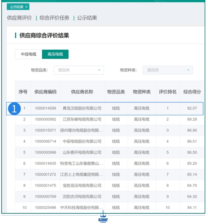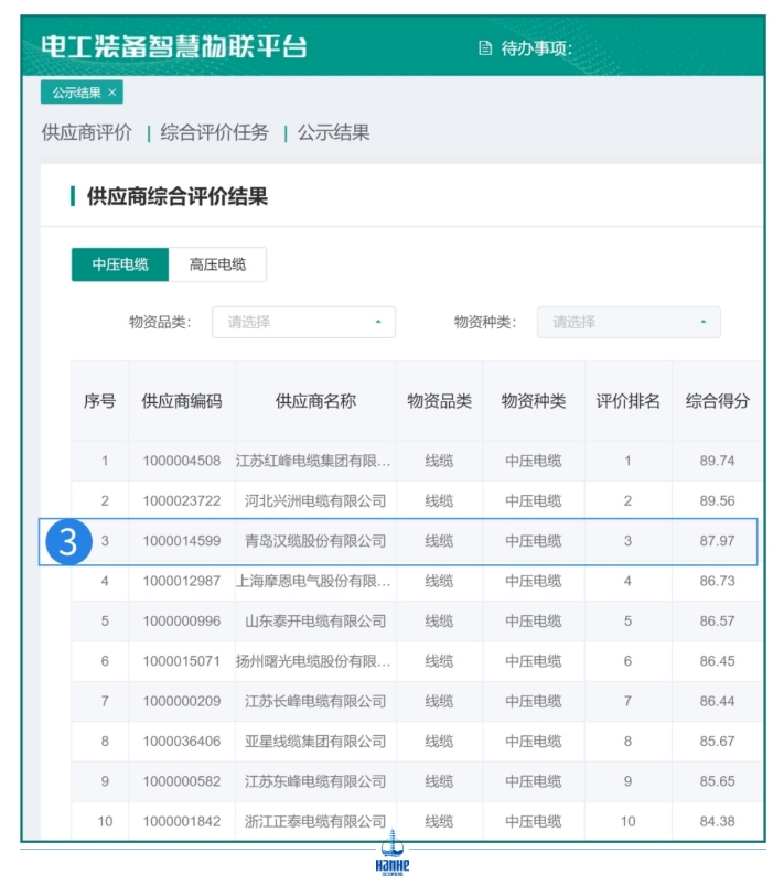 國家電網公司近期發布的2023年下半年互聯供應商綠色智造云網(EIP)接入能力與應用質量綜合評價中,青島漢纜股份有限公司憑借其在高壓電纜品類的卓越表現榮登榜首,并在中壓電纜品類中榮獲第三名佳績,充分展示了公司在推進綠色智能制造和“云監造”業務方面的強大實力與領導地位。